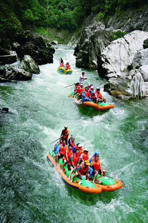 猛洞河水量豐富,河流坡降大,水急灘多浪奇,高大的峭壁直插水面,兩岸并相靠攏,形成幽深的峽谷景觀。沿河兩岸古木蒼天,蒼翠欲滴,奇石錯(cuò)落,流泉飛瀑隨處可見,下游一路水碧山青,風(fēng)光秀麗,野猴成群,溶洞奇特。猛洞河天下第一漂項(xiàng)目位于猛洞河支流,全長(zhǎng)47公里,最精彩處位于哈妮宮至牛路河段,長(zhǎng)約17公里。該景區(qū)兩岸多為原始次森林,蔥蔥郁郁,水流湍急,碧綠清亮,有十里絕壁,十里瀑泉,十里畫卷,十里洞天的美譽(yù)。其中有急流險(xiǎn)灘108處,大小瀑布20處。漂流,穿急流,越險(xiǎn)灘,闖狹谷,捕激浪,有驚無險(xiǎn),回味無窮。特別是哈妮宮、三角巖、雞籠門、遇仙峽(捏土)、閻王灘、落水坑、夢(mèng)思峽、鯉魚剖肚、三大炮等景點(diǎn),無不令人叫絕觀止。