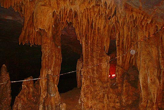 | 藏君洞為一大型天然溶洞,溶洞長25000米,已探明洞長4000m,洞內(nèi)洞中有洞、洞中有河,迂回曲折,地下河流水潺潺,溶洞分布在石炭系中、上統(tǒng)碳酸鹽巖中,洞內(nèi)鐘乳石十分豐富:石筍、石柱、石幔、石樓、石像比比皆是。洞內(nèi)構造奇特,石鐘乳千姿百態(tài)、絢麗多彩,景觀奇秀,珍品奇絕,是我國少有的大型碳酸鹽巖巖溶洞穴之一。目前已開發(fā)的4000m洞穴中,由十二個大的溶洞群構成,由洞口往里有護君堂、惠帝殿、兩重天、南巡廳、不夜城、龍鳳宮、北國廳、江南廳、江河壩、閱兵場、國寶廳等溶洞景觀區(qū)。溶洞一般高5~30m,長60~100m,寬10~20m,面積60~200㎡。十二個溶洞沿地下河呈串球狀分布,洞與洞之間有巷道(地下河管道)相連,溶洞中景觀十分豐富,仿佛是一個瑰麗的地下宮殿。如護君堂內(nèi)有“尚書帽”、“御馬”、“貓頭鷹”、“小羊羔”、“老夫妻”、“天宮浴盆”等景點,惠帝殿內(nèi)由“斷劍石”、“龍椅”、“觀音立佛”、“觀音蓮花寶座”等,“蔬果長廊”中有形似花菜、白菜、絲瓜、茄子、黃瓜等石筍,不夜城內(nèi)有乳白色石鐘乳巖溶坡面,龍鳳宮內(nèi)有石幔、石柱琳瑯滿目及鐘乳石構成的似漢白玉“龍鳳石床”、“旭日東升”的浮雕石鐘乳墻、“燈籠群”、“攀龍柱”、“石蓮花”等,國寶廳巨型石柱等,巷道側壁唐僧師徒“西天取經(jīng)”壁畫等,景觀類型齊全,是巖溶洞穴中具有典型地學意義的巖溶地貌景觀,屬國家級的地質遺跡景觀。