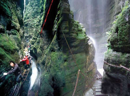 坐龍峽圖片 坐龍峽風(fēng)景區(qū)位于古丈縣河西鎮(zhèn),與“芙蓉鎮(zhèn)”--王村一水之隔。經(jīng)由300萬(wàn)年大自然的風(fēng)吹、水蝕而成,一直隱逸于湘西茫茫十萬(wàn)群山之中。它長(zhǎng)約3500米,最大高差達(dá)300余米;寬處不足丈余,窄處僅容一人通過(guò);谷內(nèi)絕壁縱疊,溪瀑橫懸,崖樹斜逸,異草遍坡。