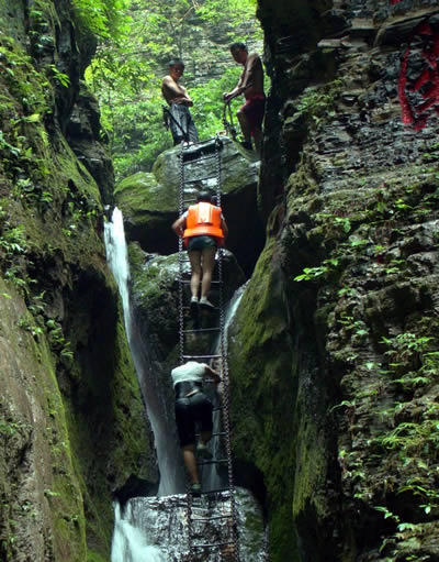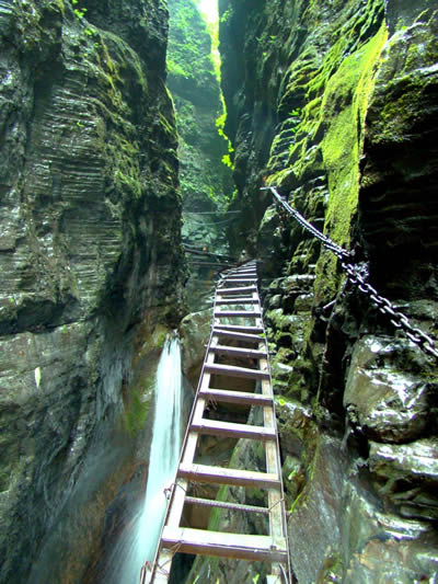 坐龍峽風(fēng)景區(qū) 坐龍峽擁有中國(guó)第一條特種游道。所有游道均建于峽谷深處,依山取勢(shì),既經(jīng)細(xì)心雕琢聽卻又渾然天成。粗樸的板栗木棧道,可以讓你零距離的親近那一潭碧幽、聽聞山泉叮咚;精巧的跳墩,可以讓你媳戲流泉、觸感溪瀑;原質(zhì)的石坎道,讓你不得不調(diào)動(dòng)全部的身心能量悉心攀援、感悟峽谷;有驚無(wú)險(xiǎn)的鐵梯,讓你伴著腳下轟鳴的溪水,在驚怵中體味一份快慰。出口處的土家山寨,保留了古樸獨(dú)特的生活習(xí)俗。一塊臘肉就一口醇香的“苞谷燒”會(huì)讓你洗去所有的疲憊,在輕松中憨厚的主人向你講述過(guò)去強(qiáng)人出沒(méi)的故事......
