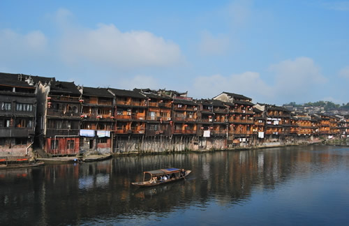 | 沱江河是鳳凰的母親河,她依著城墻緩緩流淌,世世代代哺育著古城兒女。坐上烏船,聽著艄公的號子,看著兩岸已有百年歷史的土家吊腳樓,別有一番韻味。