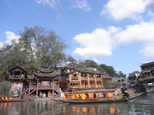 鳳凰沱江河 順水而下,穿過虹橋一幅江南水鄉(xiāng)的畫卷便展現(xiàn)于眼前:萬壽宮、萬名塔、奪翠樓……一種遠離塵世的感覺悠然而生。沱江的南岸是古城墻,用紫紅沙石砌成,典雅不失雄偉。城墻有東、北兩座城樓,久經(jīng)滄桑,依然壯觀。沱江河水清澈,城墻邊的河道很淺,水流悠游緩和,可以看到柔波里招搖的水草,可以撐一支長篙漫溯。