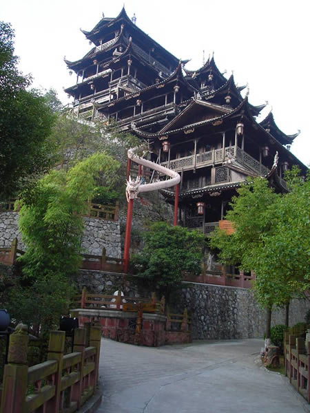 九重天 九重天世襲堂是土家風(fēng)情園的精華和靈魂所在。該建筑由土家民間藝人李宏進(jìn)設(shè)計(jì),依80度陡坡而建,高48米,共9重12層,整個(gè)樓房全部用木栓連接,沒有一顆鐵釘,堪稱土家族建筑史上的奇跡。2002年9 月22日,九重天吊腳樓被載入世界吉尼斯世界紀(jì)錄,認(rèn)定其為目前中國最大、最高、最完美的木質(zhì)結(jié)構(gòu)吊腳樓。2001年4月6日,朱镕基總理視察土家風(fēng)情園時(shí),對(duì)九重天贊不絕口:“一批民間匠人能造出這樣輝煌的吊腳樓,而且還解決了力學(xué)的問題,真是不簡(jiǎn)單。”清華大學(xué)著名建筑學(xué)家何重義先生說:“張家界土家風(fēng)情園完全可以和蘇州的園林相媲美。特別是九重天世襲堂,猶如玉宇瓊閣,令人神往!”古人說,天有九野,地有九州,土有九山,山有九寨。古人又把九重叫做天,說天有九重,最上一重是上帝和君主居住的地方,所以我們叫它“九重天”。