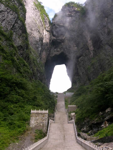 | 天門洞是天門山最具有代表意義的景點(diǎn),它位于天門山山體的中上部,海拔1300米,門高131.5米,寬57米,深60米,是世界上最高海拔的天然穿山溶洞。