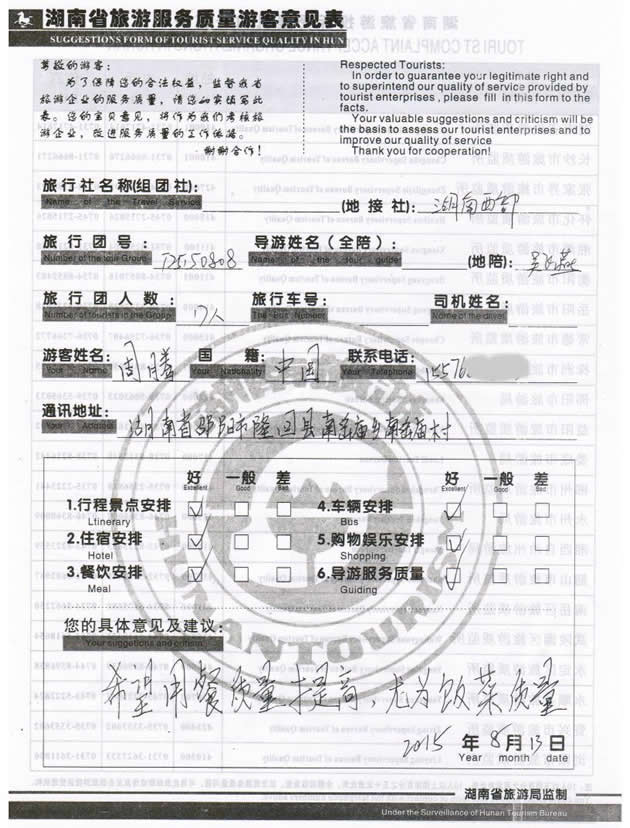 8月初,湖南邵陽周先生一行17位貴賓與湖南西部(張家界)中國國際旅行社工作人員——小王取得聯(lián)系,經(jīng)過商談,雙方達(dá)成協(xié)議并簽訂旅游合同,于8月9日抵達(dá)張家界,開始張家界之旅。此次行程是由我社優(yōu)秀導(dǎo)游——吳飛燕負(fù)責(zé)旅游接待工作,吳導(dǎo)在旅游過程中講解詳細(xì),客人也很滿意,在意見表上要求我們:希望用餐質(zhì)量提商,尤為飯菜質(zhì)量,我們感謝周先生為我社提出了寶貴意見,謝謝周先生。同時也感謝周先生選擇湖南西部(張家界)中國國際旅行社,以及您對湖南西部國旅的信任與支持。我們會繼續(xù)努力,做好旅游接待工作。期待下一次與您的合作,祝您愉快!