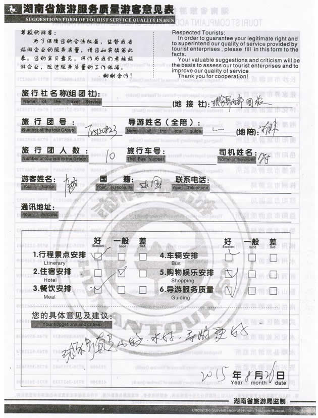 8月上旬,江蘇肖女士一行10位貴賓與湖南西部(張家界)中國國際旅行社工作人員——小王取得聯(lián)系,經(jīng)過商談,雙方達(dá)成協(xié)議并簽訂旅游合同,于8月23日抵達(dá)張家界,開始張家界之旅。此次行程是由我社優(yōu)秀導(dǎo)游——褚偉負(fù)責(zé)旅游接待工作,褚導(dǎo)在旅游過程中講解詳細(xì),客人也很滿意,在意見表上寫道:張家界真是山好、水好、導(dǎo)游更好。同時也感謝肖女士一行貴賓選擇湖南西部(張家界)中國國際旅行社,以及您對湖南西部國旅的信任與支持。我們會繼續(xù)努力,做好旅游接待工作。期待下一次與您的合作,祝您愉快!