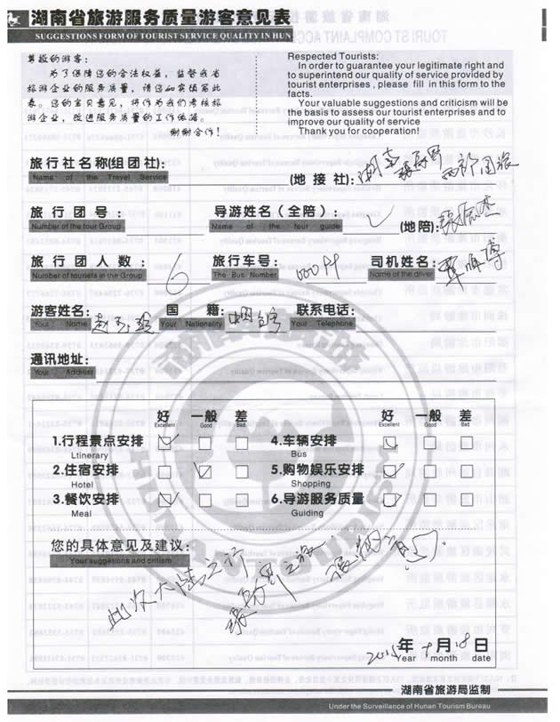 5月份,臺灣趙女士一行6位貴賓與湖南西部(張家界)中國國際旅行社工作人員——小龔取得聯(lián)系,經(jīng)過商談,雙方達(dá)成協(xié)議并簽訂旅游合同,于9月12日抵達(dá)張家界,開始張家界之旅。此次行程是由我社優(yōu)秀導(dǎo)游——張杰負(fù)責(zé)旅游接待工作,張導(dǎo)在旅游過程中講解詳細(xì),客人也很滿意,在意見表上寫道:此次大陸之行、張家界之旅、很滿意。同時(shí)也感謝趙女士一行貴賓選擇湖南西部(張家界)中國國際旅行社,以及您對湖南西部國旅的信任與支持。我們會繼續(xù)努力,做好旅游接待工作。期待下一次與您的合作,祝您愉快!