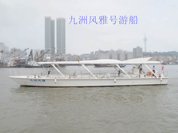 “九洲風(fēng)雅”號(hào)游船:船長(zhǎng)23.08米,寬5.03米,擁有80客位。此船造型簡(jiǎn)約,有很強(qiáng)的時(shí)尚設(shè)計(jì)感,與馬爾代夫的游船同款。